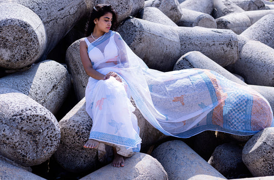 Our Kota saree range is truly one of a kind. Inspired by the serenity of a summer breeze over an ethereal lake, these drapes are woven with precision by the skilled karigars of Kaithoon. Each saree is adorned with intricate artistry—Sanganer block prints, Chikankari embroidery, Leheriya patterns, and Bagru block printing—blending these exquisite techniques seamlessly on the borders and body to create a chic and modern drape story.