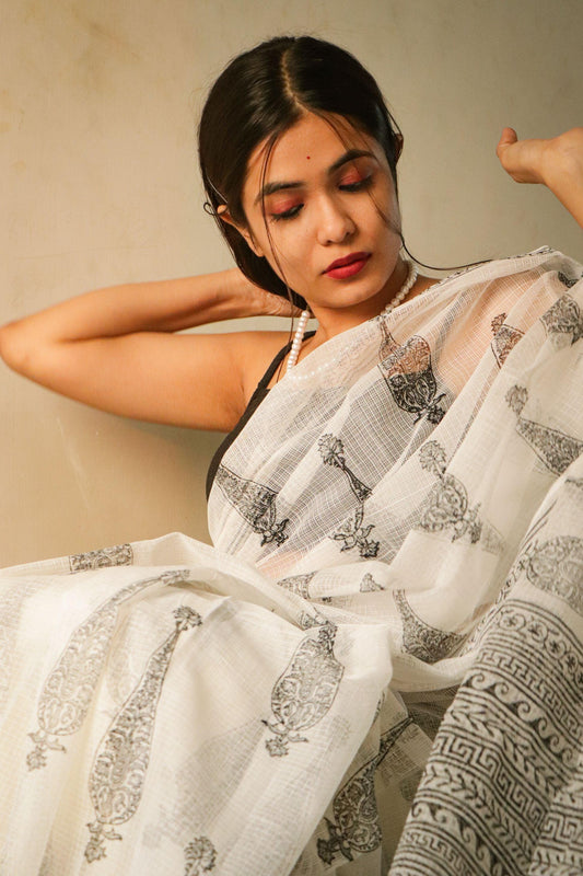 Your Kaisori range of sarees is a celebration of India's rich textile heritage, meticulously handcrafted and embellished with embroidery patterns and printing techniques from across the country. Each piece is a unique expression of artistry, blending traditional craftsmanship with contemporary design to create the perfect ethnic ensemble. Whether it's the intricate handwoven threads, the vibrant block prints, or the delicate zari work, Kaisori sarees offer timeless elegance, making them the ideal choice to match any look, while honoring the age-old craft traditions of India.