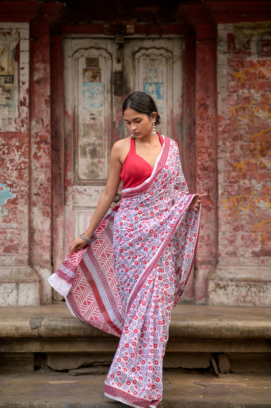 Kaisori Aira pink tulip cotton hanblockprinted saree