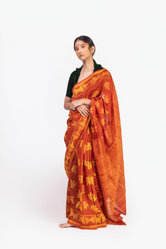 A trsyt with Ajrakh - Jharokha - red chanderi ajrakh saree