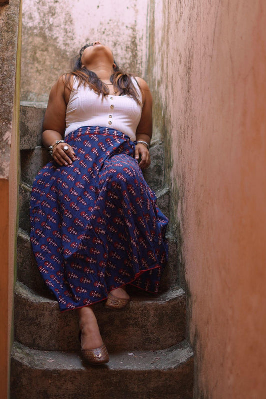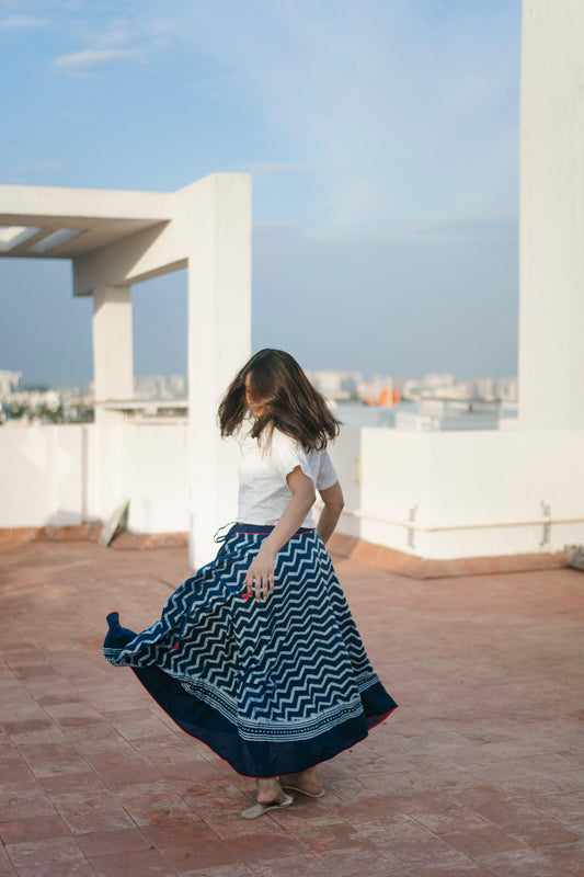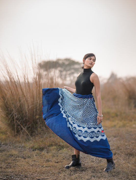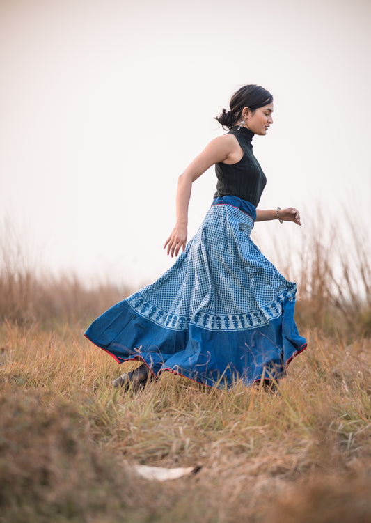 Our Kaisori block-printed Mulmul skirt celebrates Northwest Rajasthan's age-old folk mud-resist printing technique, using superior quality natural indigo on soft, breathable Mulmul fabric.
