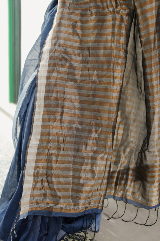 Celebrating Bengal handlooms - Sitara- Navy Blue linen cotton saree