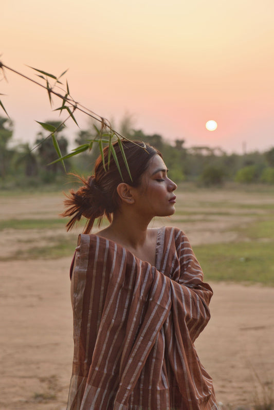 This collection is a result of our collaboration with the skilled Jamdani weavers of Bengal, blending tradition with contemporary design. Each saree in Sitara is handwoven and handspun, featuring a high 170-count cotton and linen blend, enhanced with delicate zari embellishments. The elegant soft hues of the fabric bring out the contemporary silhouettes, making each piece a unique and effortless wear, perfect for the festive season.