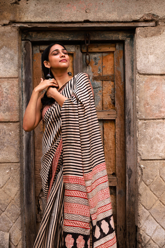 Natural dyed Bagru saree - Roheda- Stripes Syahi Begar