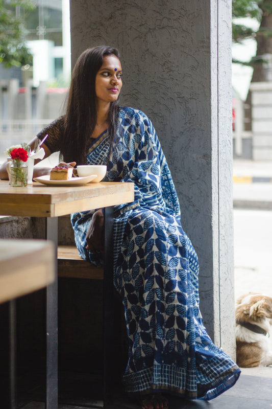 Natural dyed Dabu sarees - Malhar -Pharad Leaf Indigo