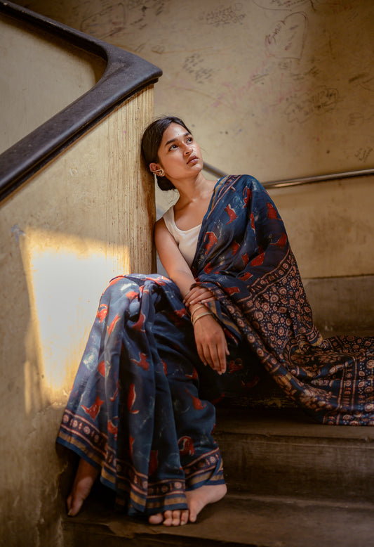 Natural dyed Bagru saree - Roheda- Mughal Syahi Begar