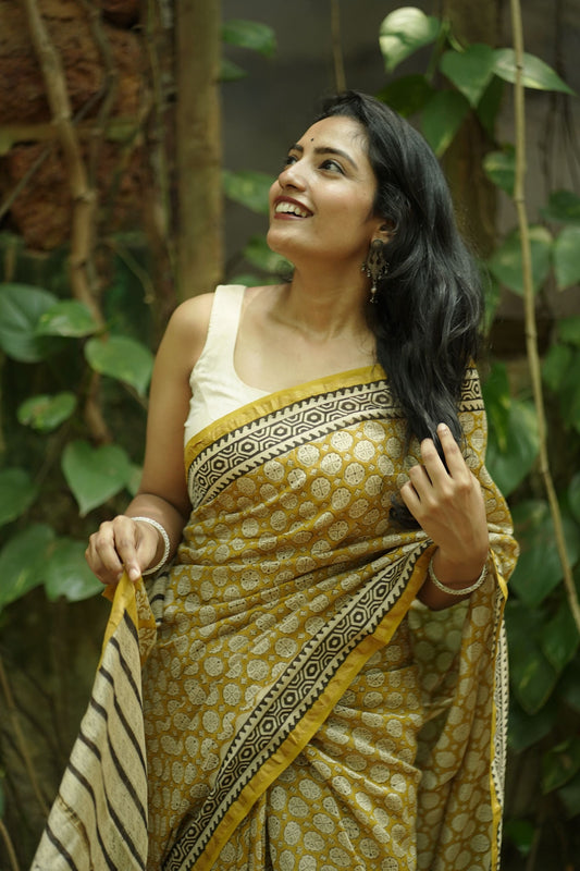 Natural dyed Bagru saree - Roheda- Yellow Syahi Begar