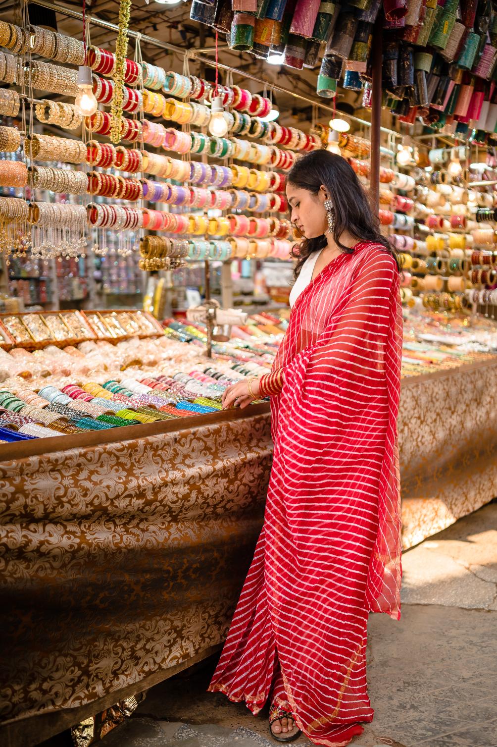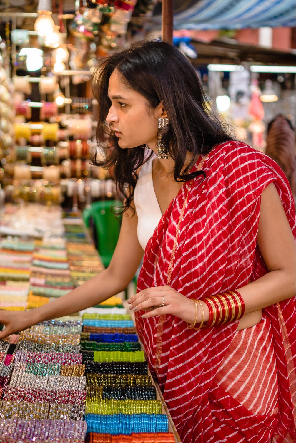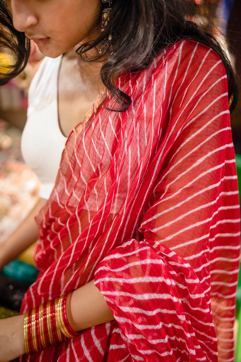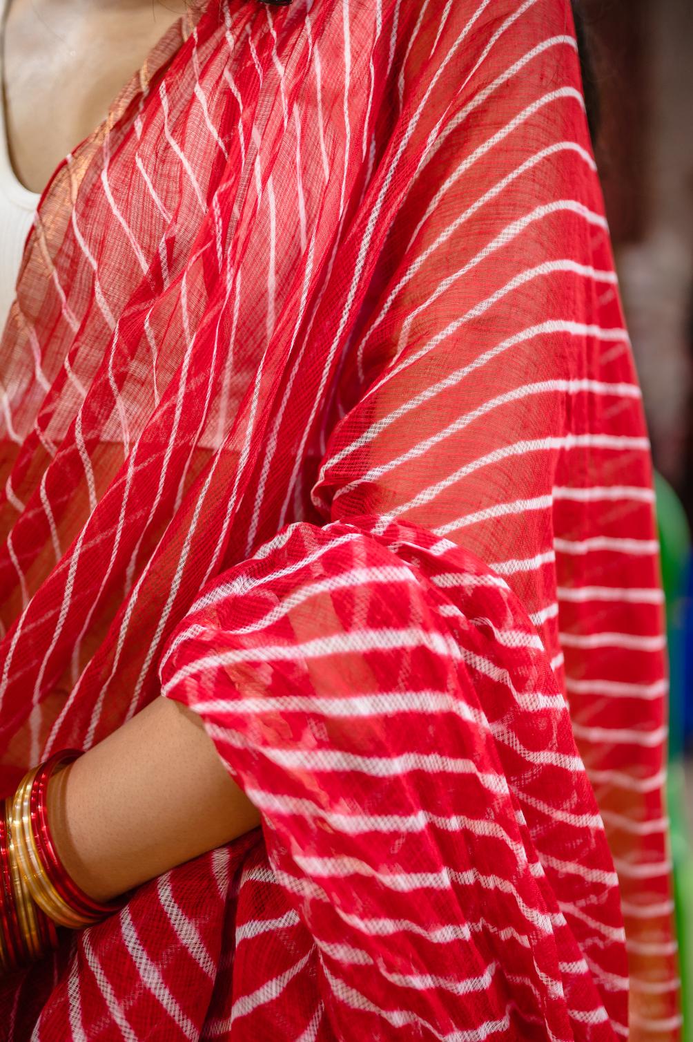 Leheriya is a traditional tie-and-dye technique that originated in Rajasthan. The word "Leher" means "waves." The fabric is diagonally folded and tied with thread before being immersed in dye, and the resist is removed to reveal beautiful diagonal stripes.