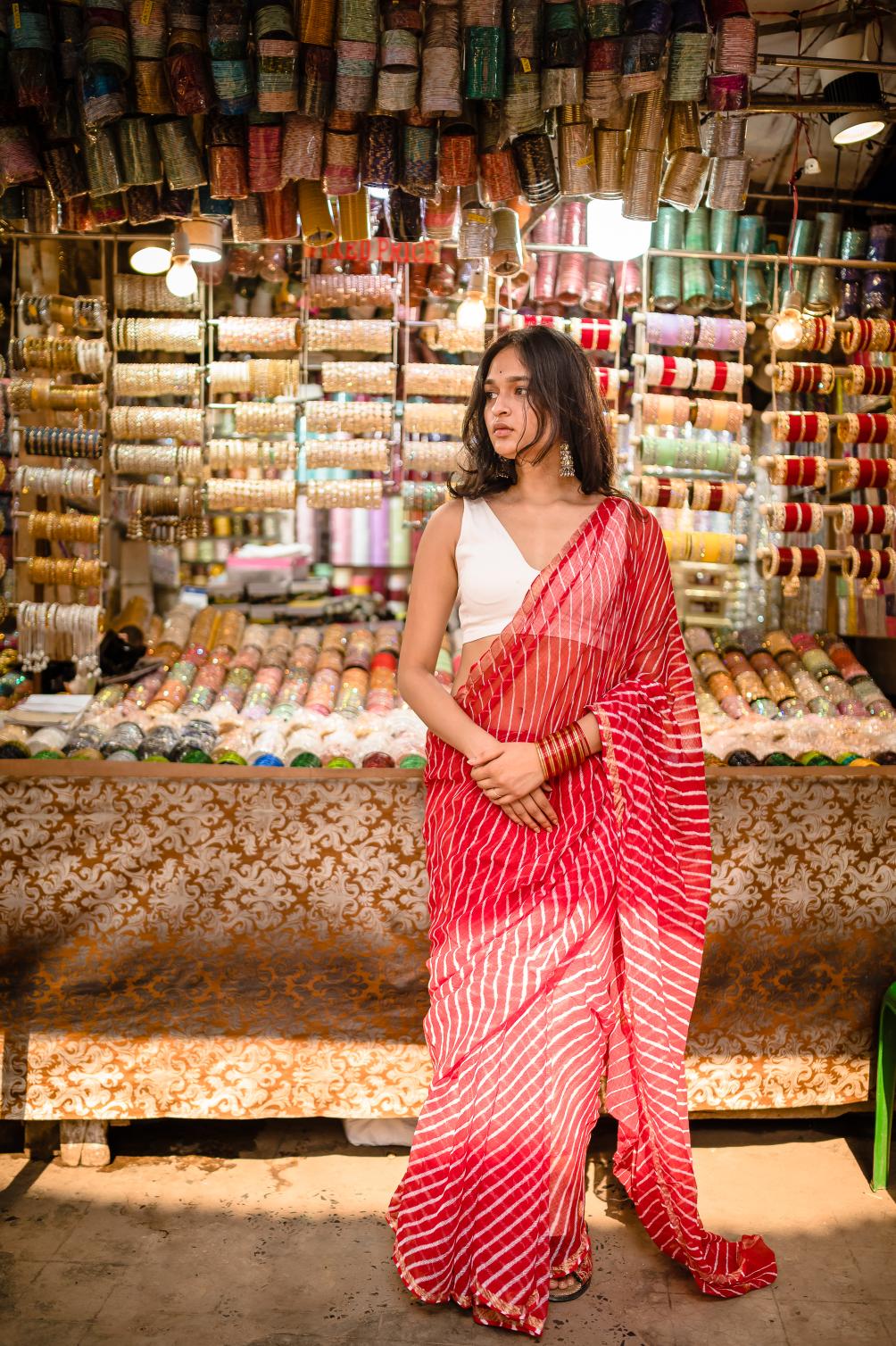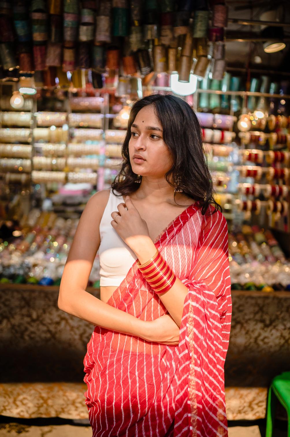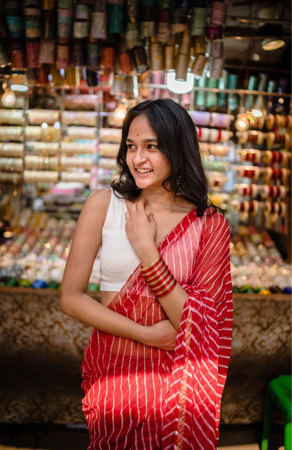 Our Aira Jaipuri Leheriya saree range is truly one of a kind. Hand-dyed after intricate knot tying in the historic lanes of Jaipur, it features pristine white Kota fabric adorned with Leheriya patterns on the border and body, crafting a chic new drape story.