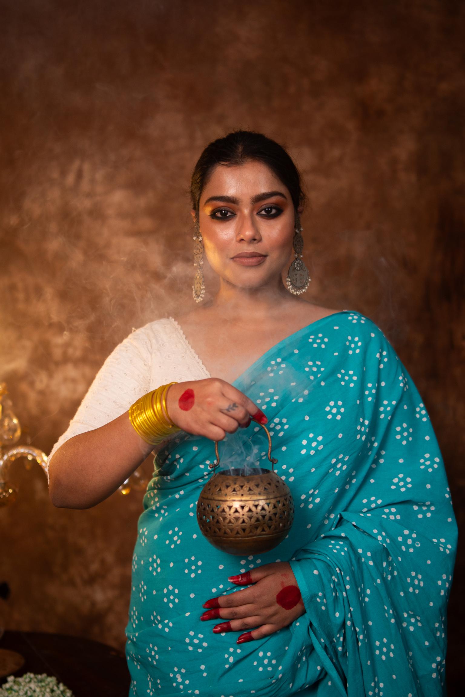 Hand knotted Kutchi Bandhani Blue cotton saree - Boondh