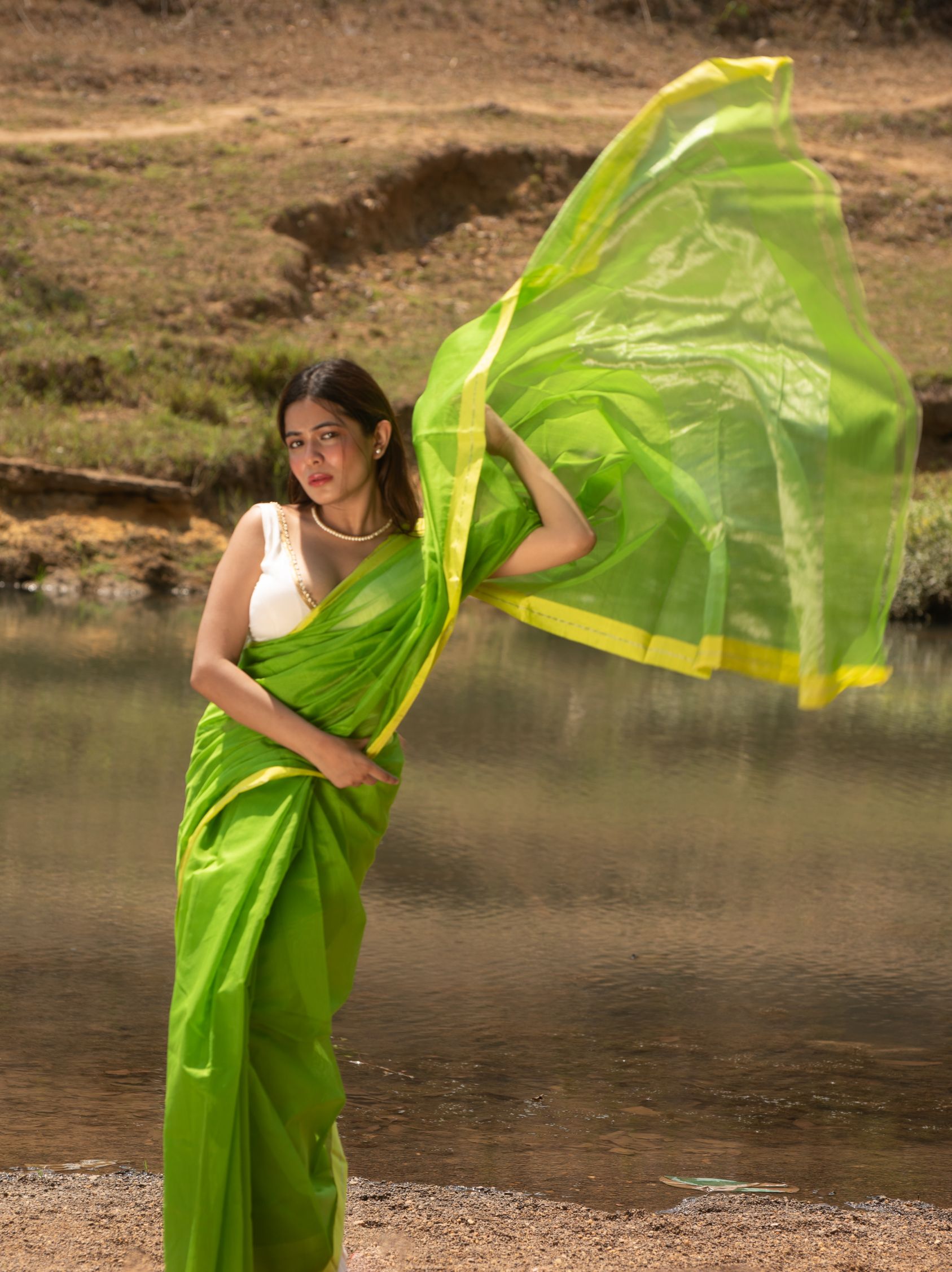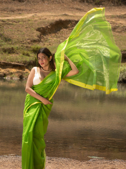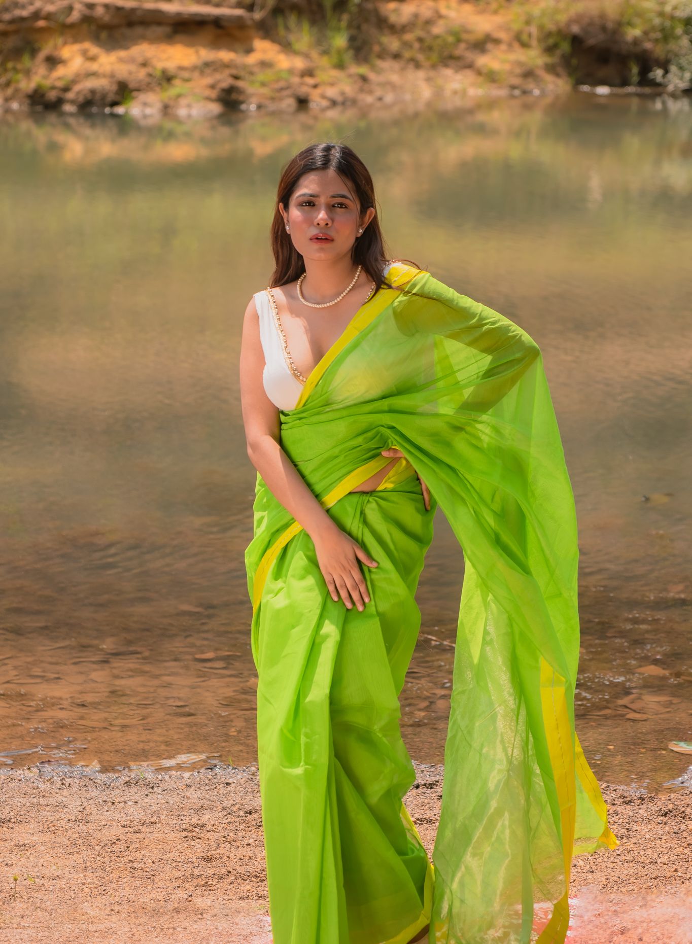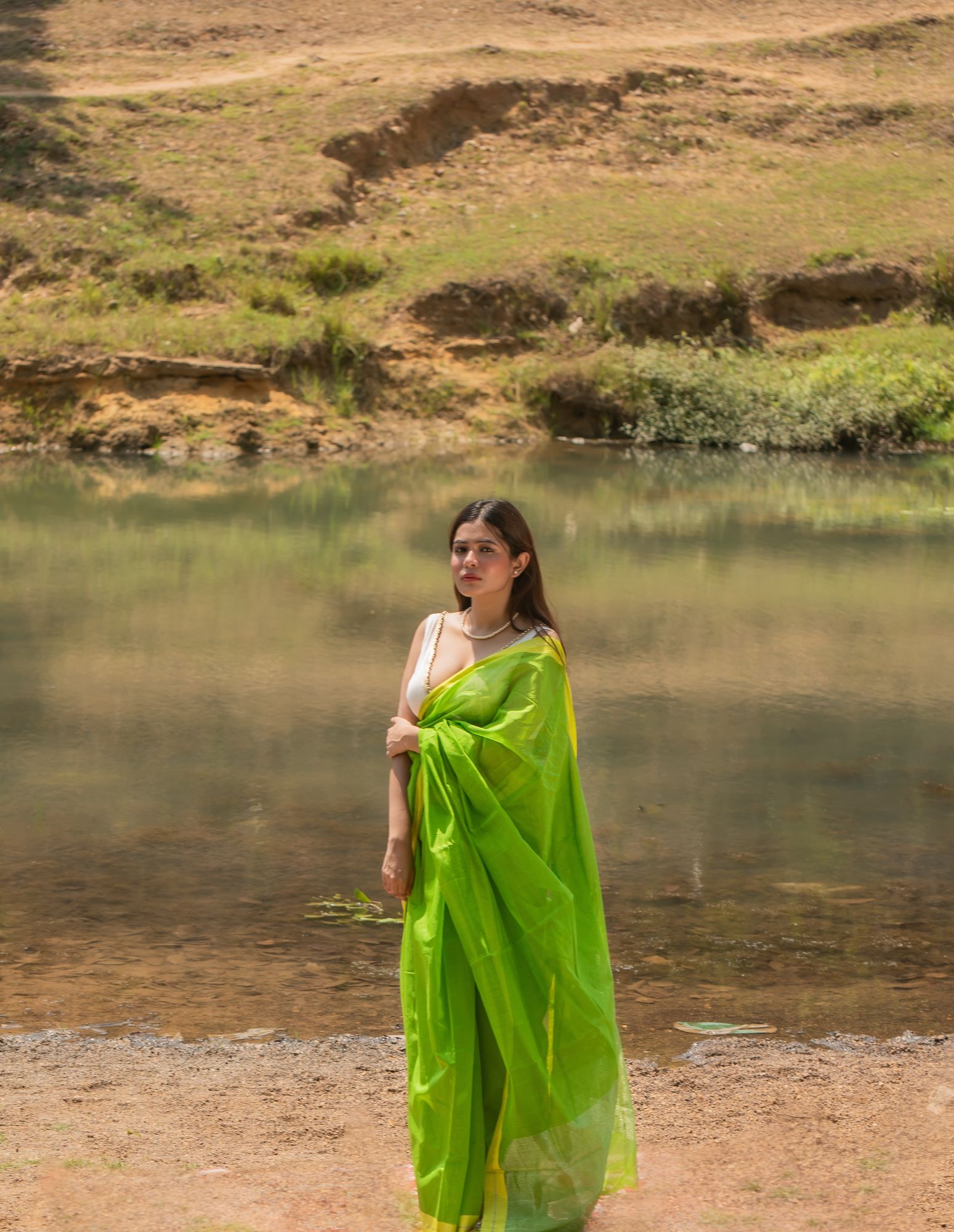 Fabric : Handwoven and handspun Cotton Silk with dual hues on body and double color Pallu