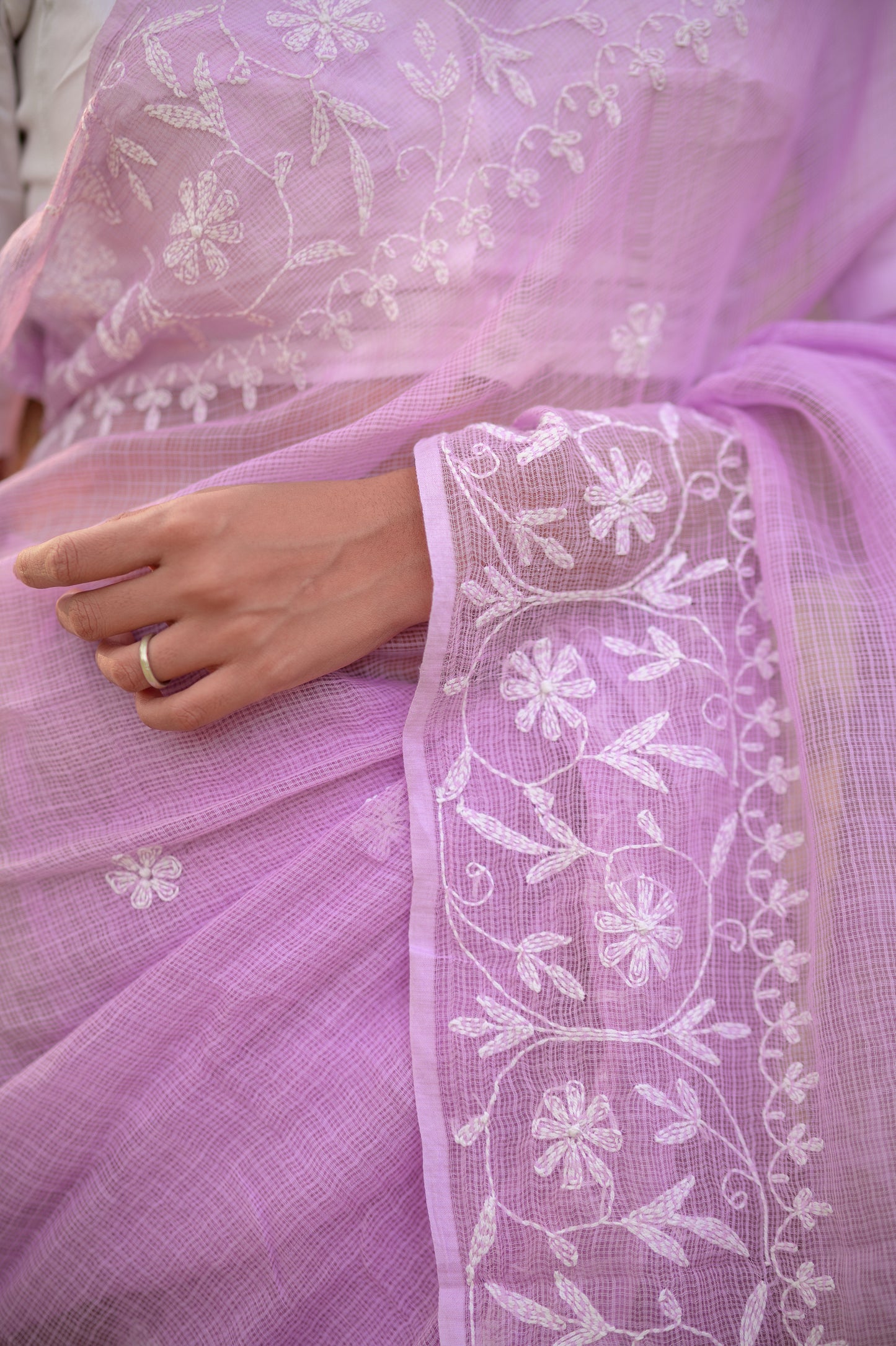 Each saree in this collection is meticulously hand-embroidered by skilled artisans, featuring intricate floral and paisley motifs that reflect the finesse of age-old techniques. The airy, translucent texture of Kota fabric adds a touch of effortless elegance, making these sarees perfect for both festive occasions and casual gatherings