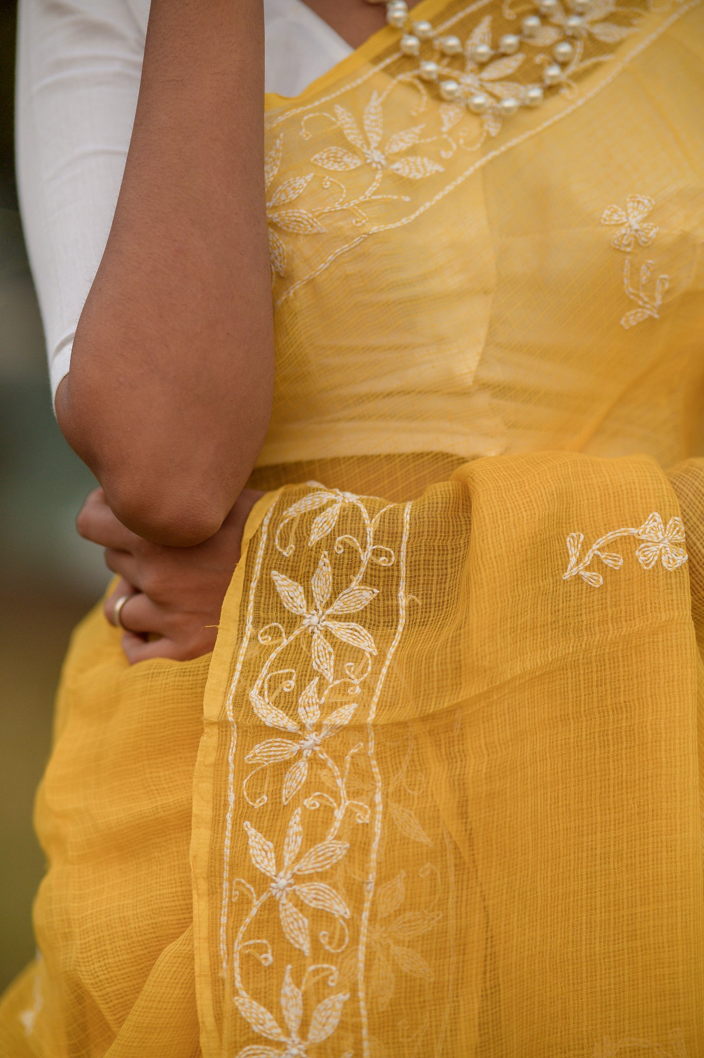 Fabric: Soft Kota saree, hand- embroidered with Chikakari in azo-free dyes.