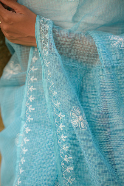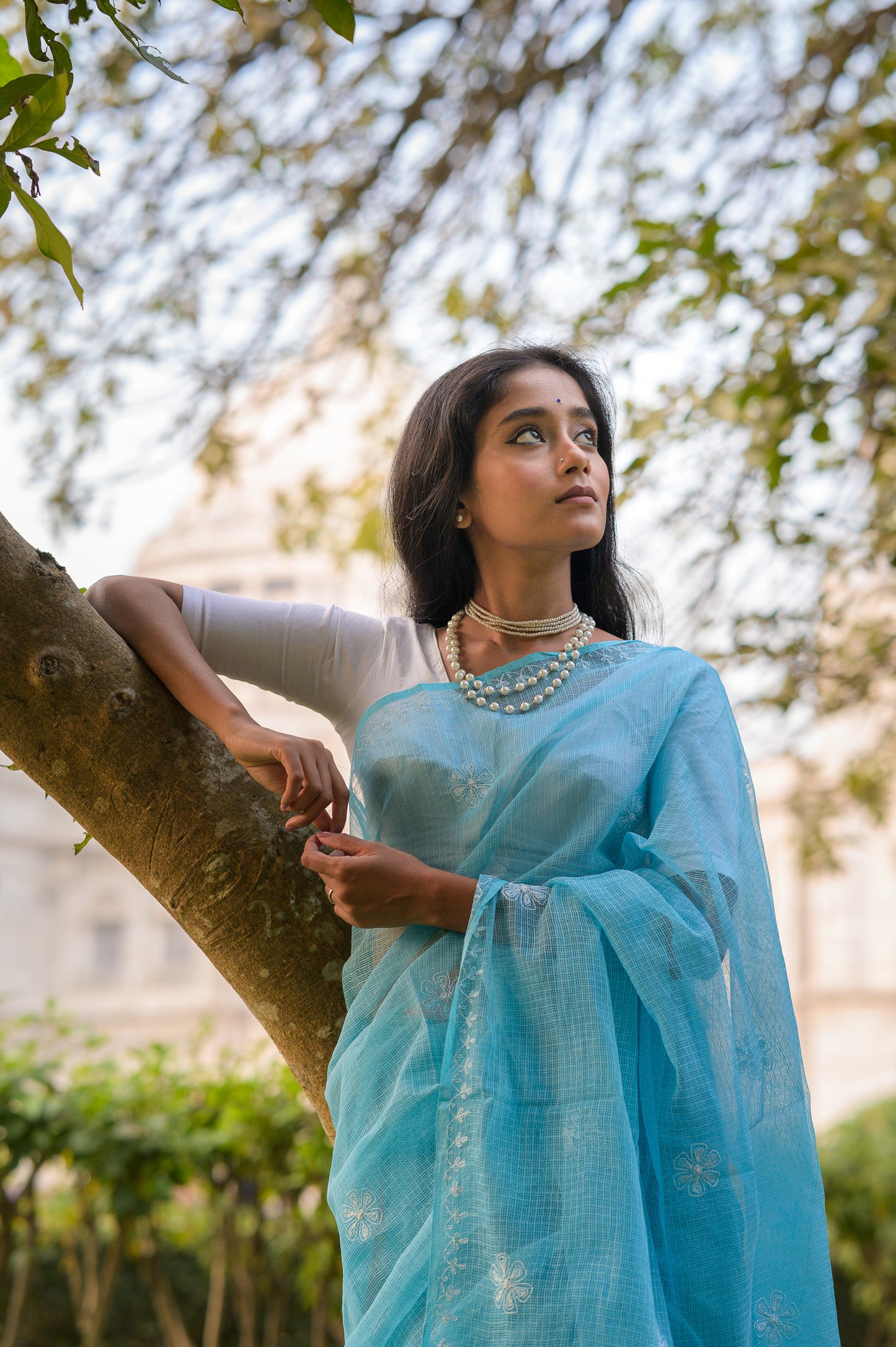 Each saree in this collection is meticulously hand-embroidered by skilled artisans, featuring intricate floral and paisley motifs that reflect the finesse of age-old techniques. The airy, translucent texture of Kota fabric adds a touch of effortless elegance, making these sarees perfect for both festive occasions and casual gatherings