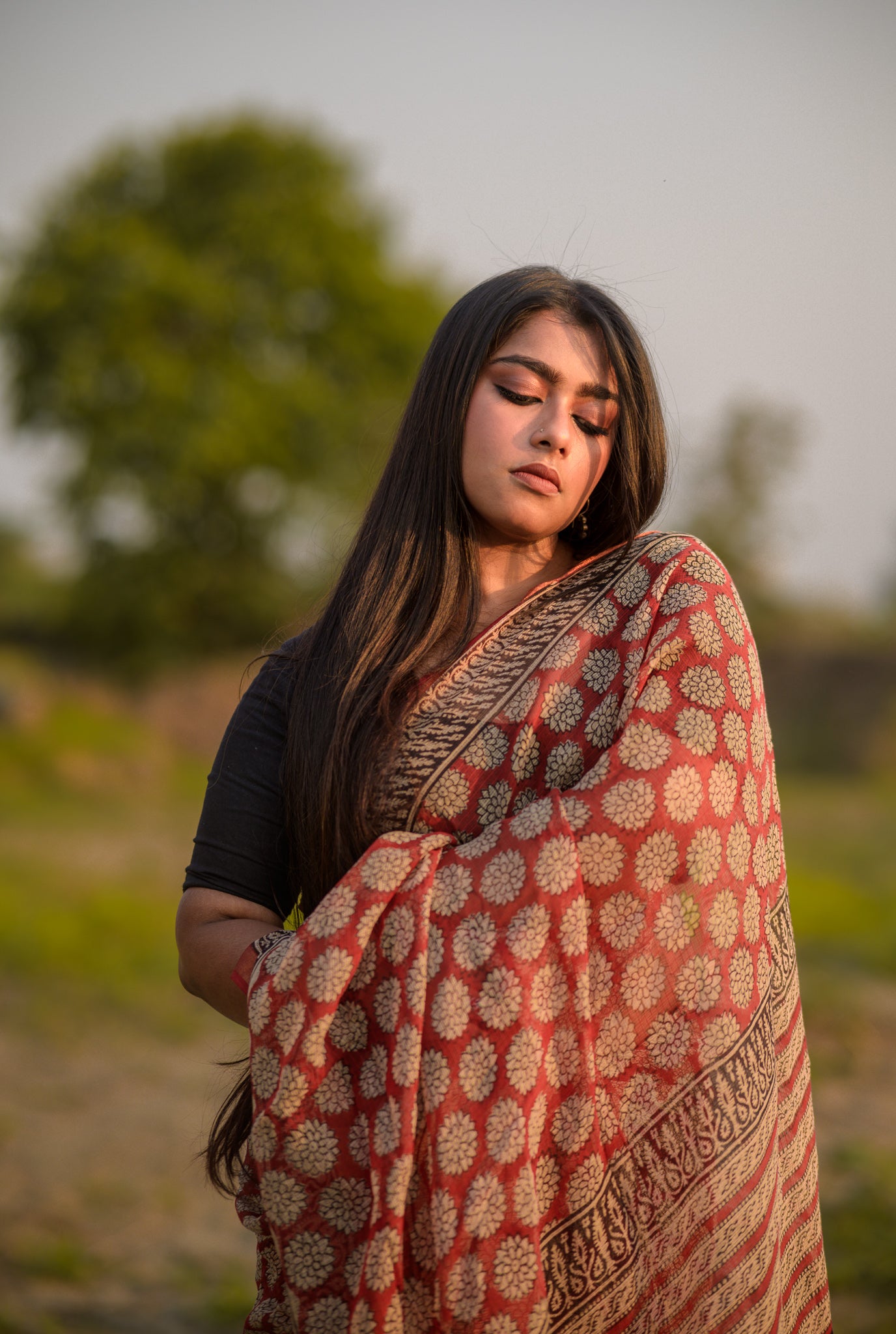 Every saree, stole, and dupatta in the Roheda range is a canvas of natural dyes and hand-carved patterns, reflecting the rhythm of the desert and the artistry of its people.