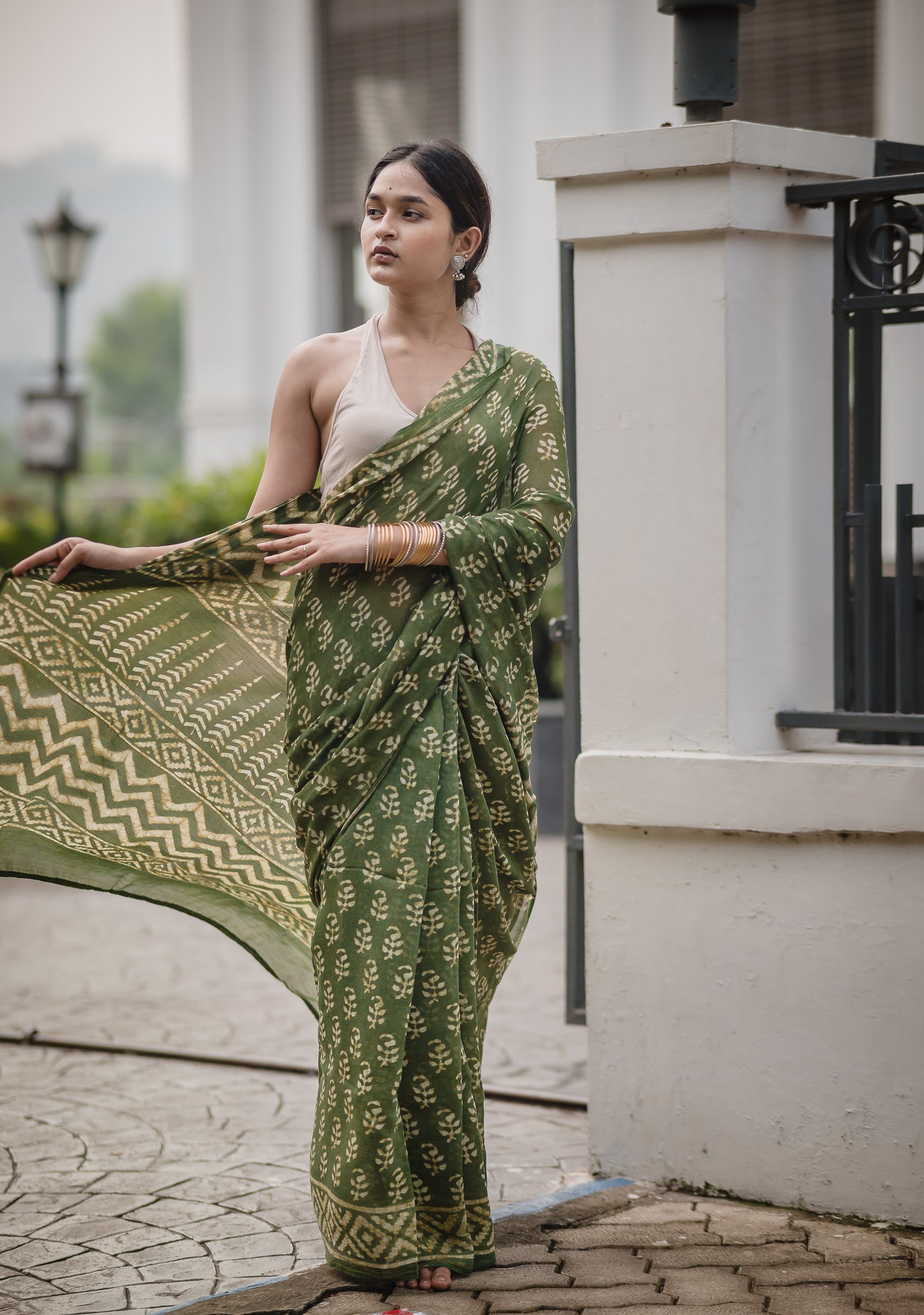 Natural dyed Bagru saree - Roheda- Chevron Syahi Begar